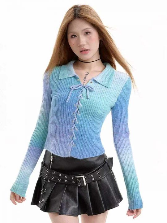 春秋新款复古渐变设计感系绳洋气针织毛衣开衫,独立包...