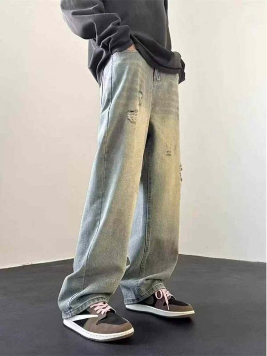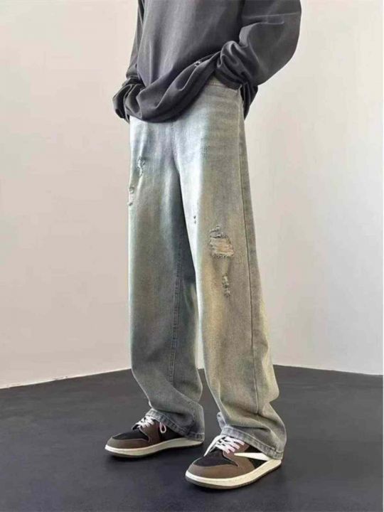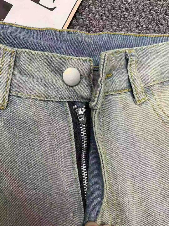 春秋新款男女同款复古蓝破洞设计款牛仔裤,独立包装带...