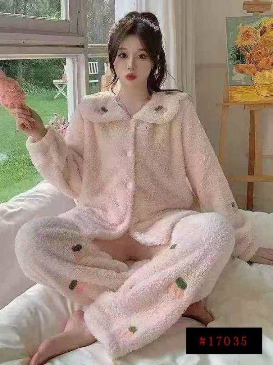 秋冬季粉色睡衣冬天加厚珊瑚绒法兰绒长毛绒家居服套装,版型宽松大,面料舒...