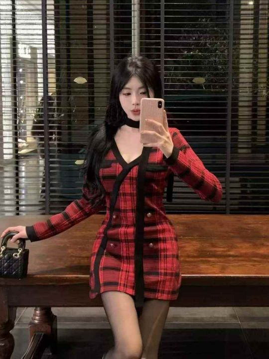 捡漏款,秋冬新款复古红色格纹小香风双排扣针织毛衣连衣裙,独立包装,均码面料柔软舒适弹力大,88件,全清7.9元超低价秒杀!
