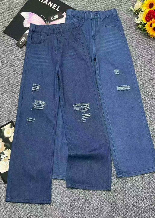 春夏季新款品牌原单宽松半松紧腰破洞设计款直筒阔腿牛...