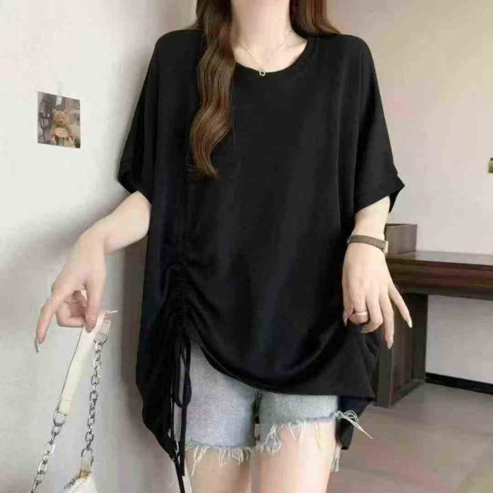 网红开衩不规则中长款中袖抽绳防晒衣t恤女夏洋气时髦...