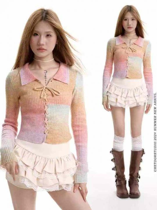 春秋新款复古渐变设计感系绳洋气针织毛衣开衫,独立包装,均码面料软糯舒适...