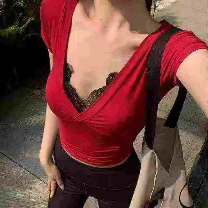 显瘦性感纯欲V领蕾丝短袖T恤女夏昆士兰平纹辣妹正肩上衣,数量388件,码数 ...