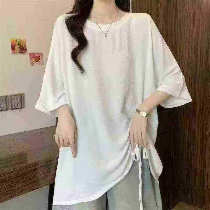 网红开衩不规则中长款中袖抽绳防晒衣t恤女夏洋气时髦...