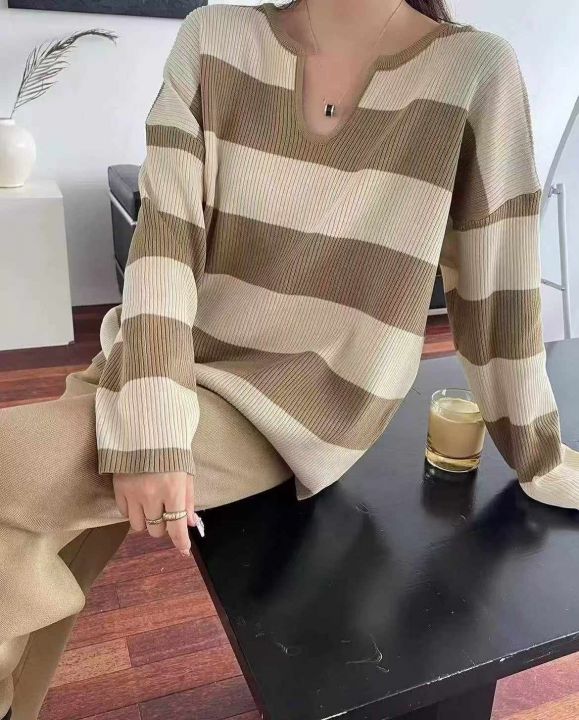 秋冬新款时尚洋气显瘦韩版宽松微胖MM撞色条纹针织套头...