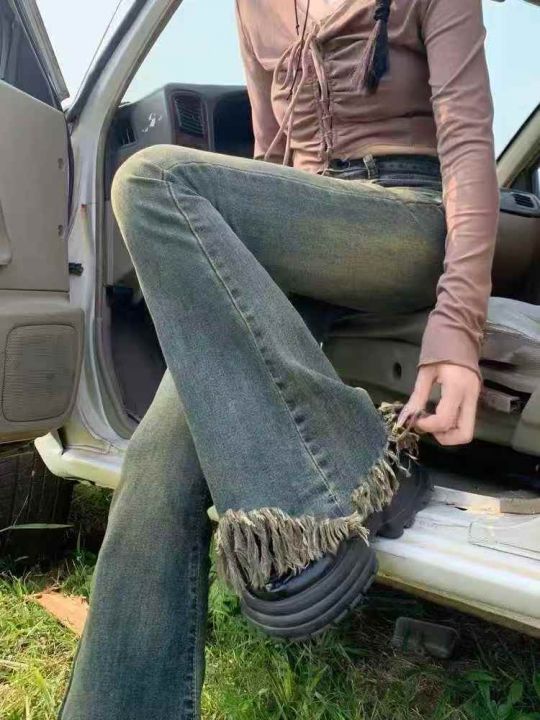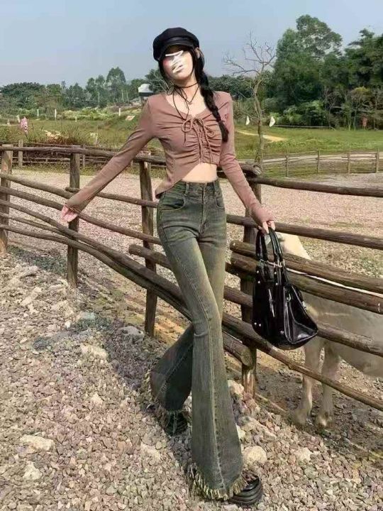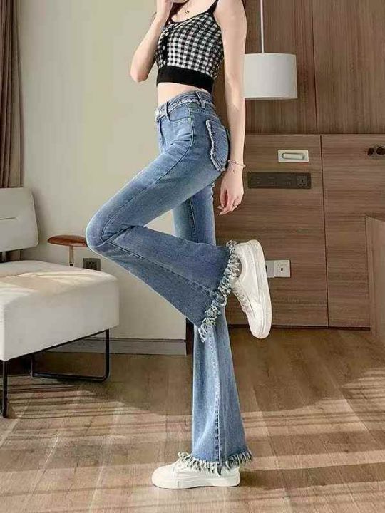 新款微喇叭流苏牛仔裤女春秋弹力修身高腰显瘦修身马蹄...