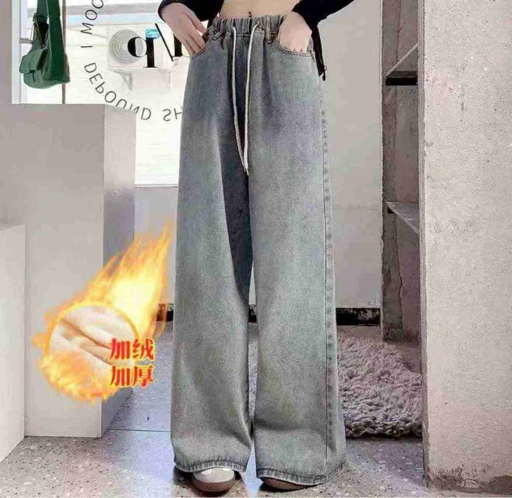 冬季加绒加厚松紧腰刺绣直筒阔腿牛仔裤,工厂货没有包...