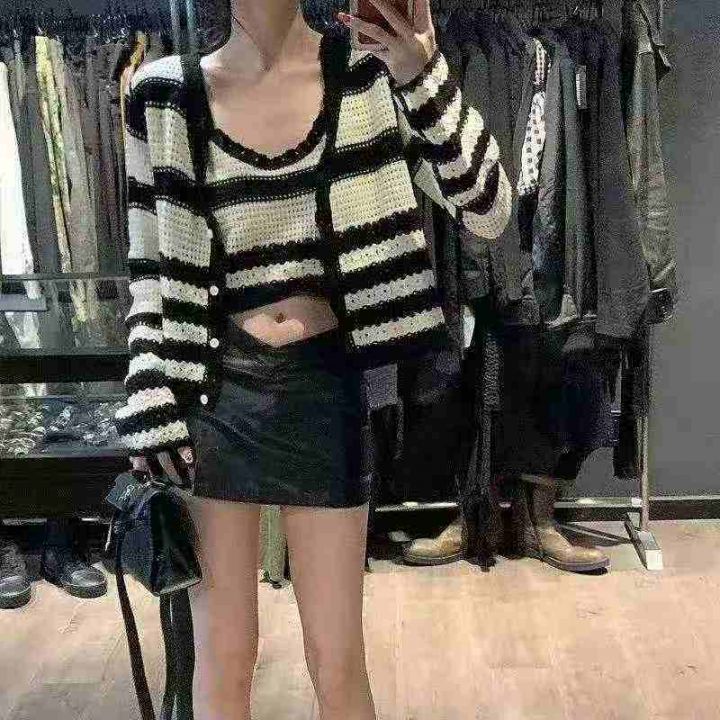 捡漏款,春季新款设计感小众法式条纹镂空针织开衫,独...