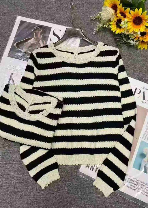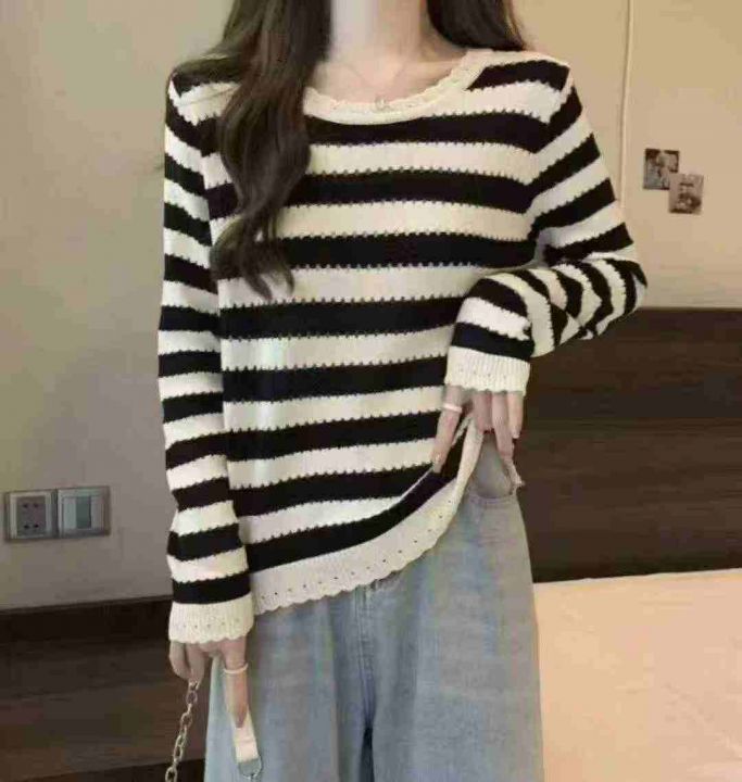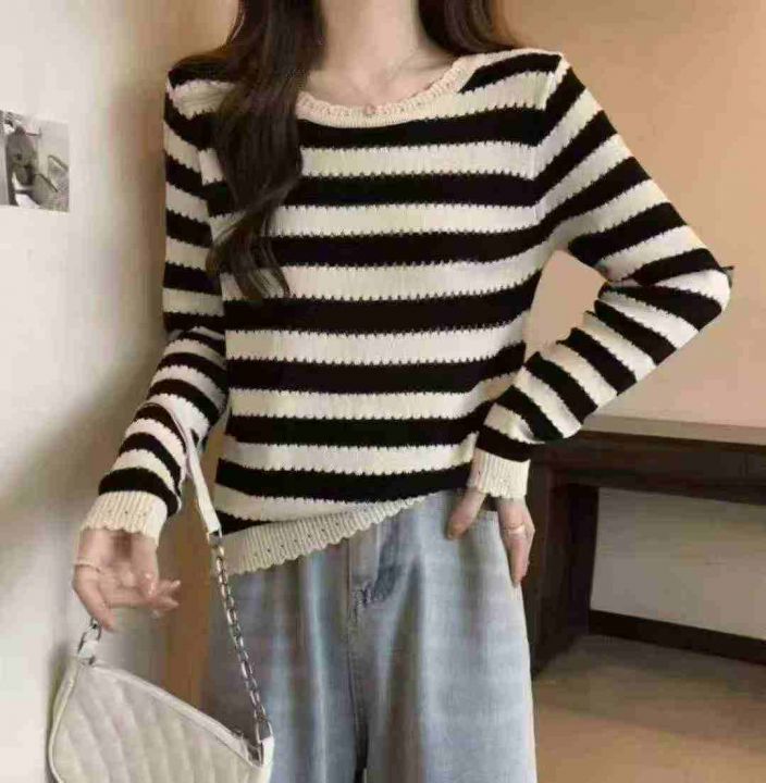 春秋新款撞色条纹时尚百搭宽松韩版针织毛衣套头毛衣,...