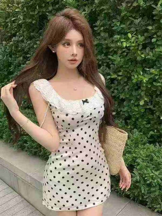 LookYiYi法式蕾丝花边波点吊带连衣裙女夏季甜美收腰修...
