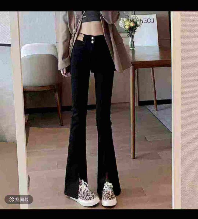 高腰开叉显瘦微喇弹力牛仔裤,整款2色,独立包装,数...