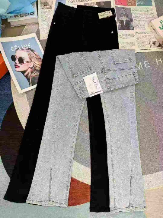 高腰开叉显瘦微喇弹力牛仔裤,整款2色,独立包装,数...