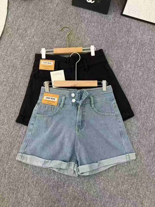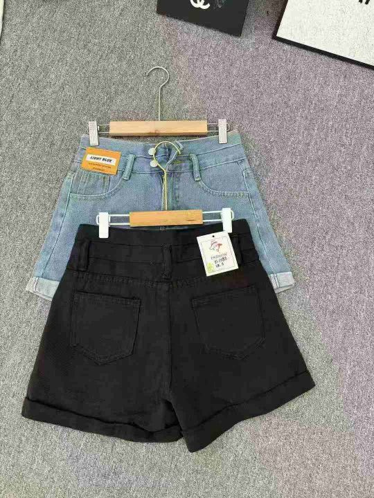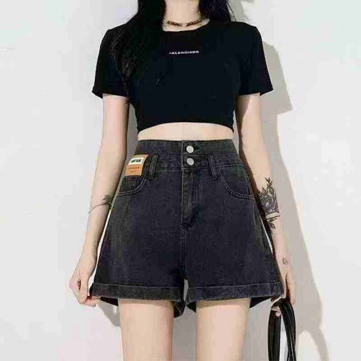 清8.8分货➕1黑色双扣高腰卷边牛仔短裤女夏季新款宽松...
