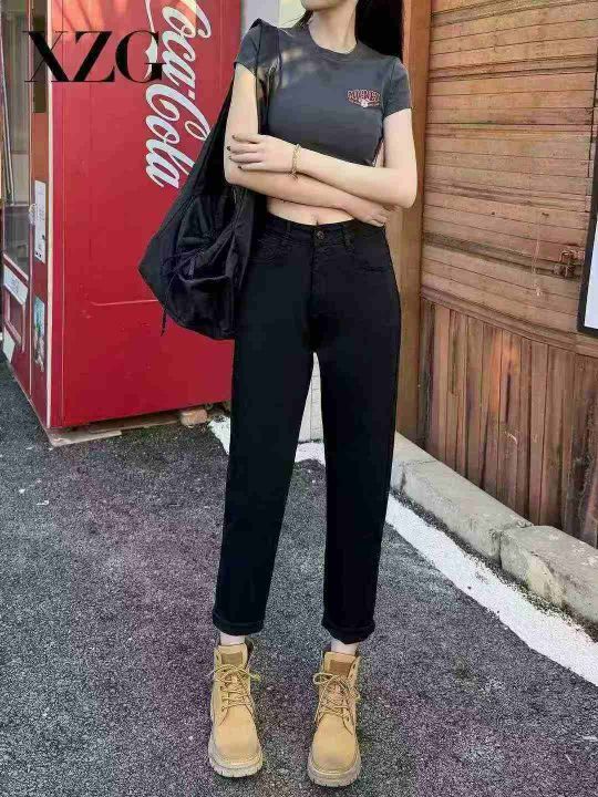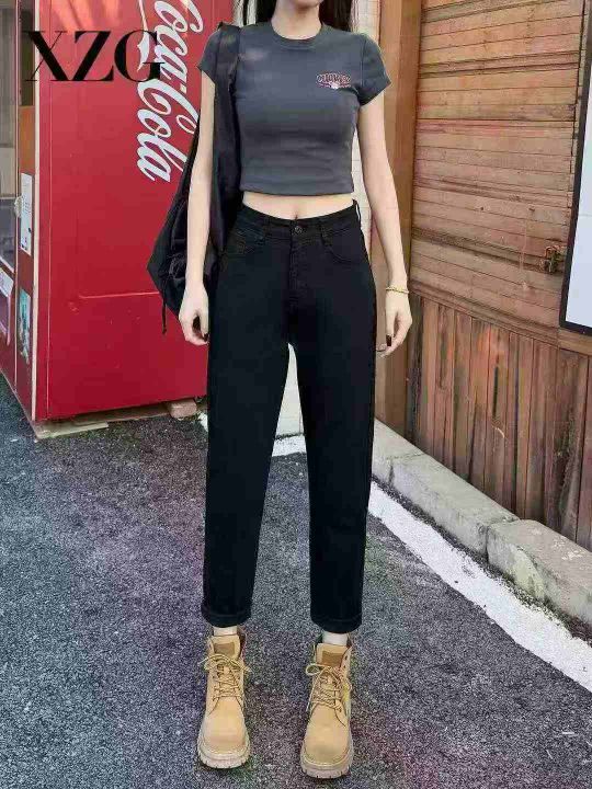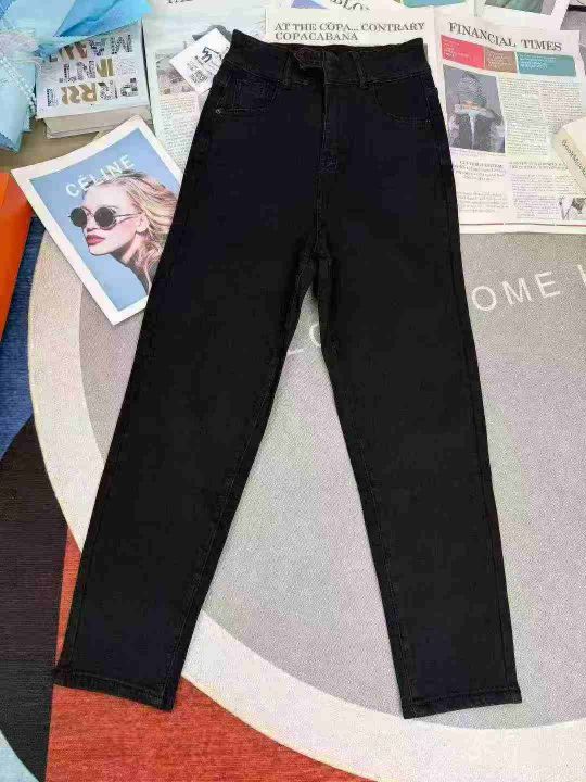 黑色哈伦高腰显瘦小脚抓绒老爹弹力牛仔裤,单款单色,...