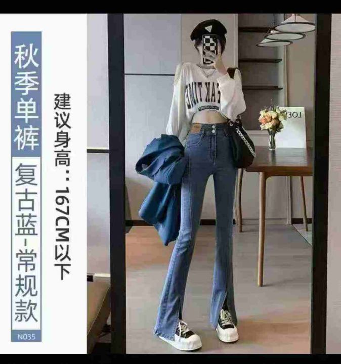 高腰开叉显瘦微喇弹力牛仔裤,整款2色,独立包装,数...