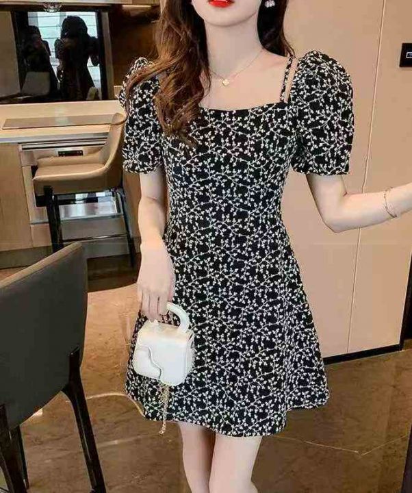 绣花泡泡袖连衣裙143件8.5,一字领,有内衬,侧腰拉链,肩带可调节,码数1-...