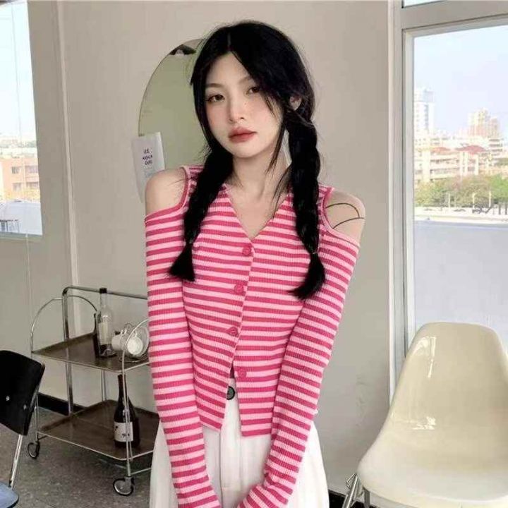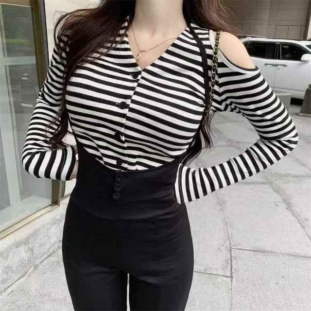 春夏季新款纯欲风V领露肩小心机设计感条纹显瘦针织开...