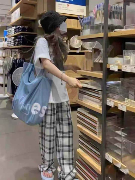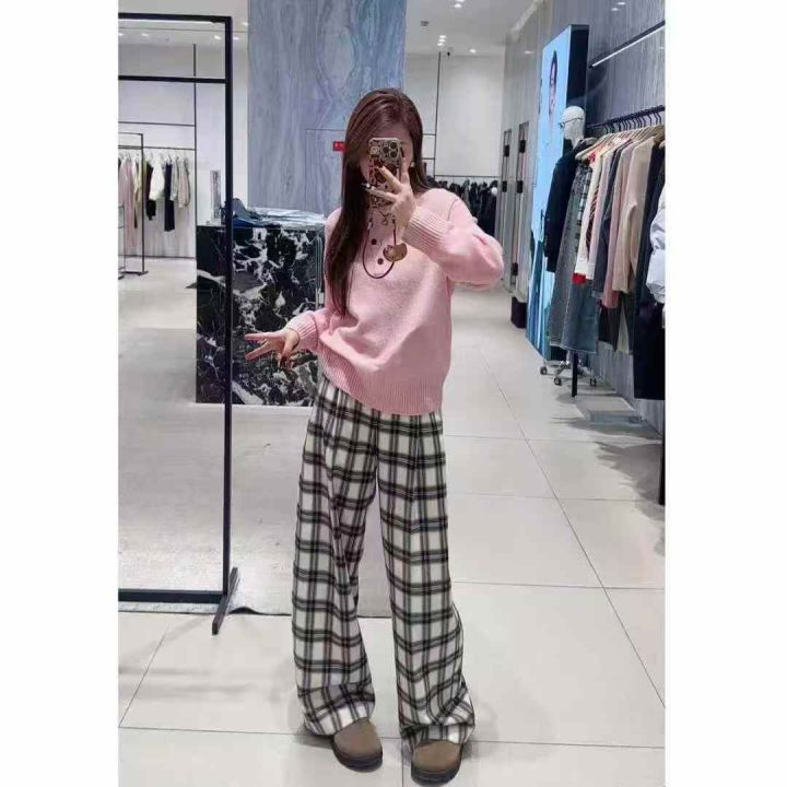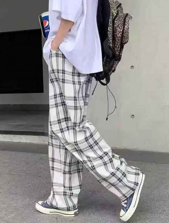 ☕️韩版港风chic百搭休闲高腰宽松格子休闲裤阔腿裤15...