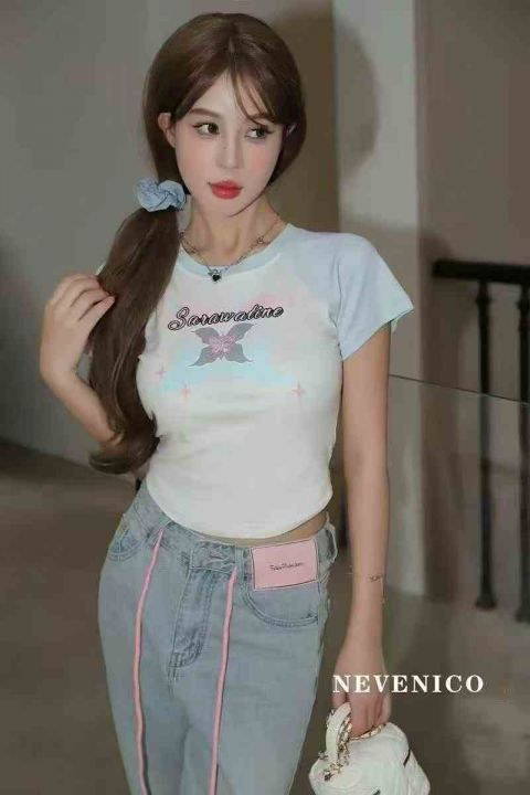 清5.8分货➕1甜酷蝴蝶拼色插肩短袖t恤女,带弹力,数量450件,码数S-XL,独...