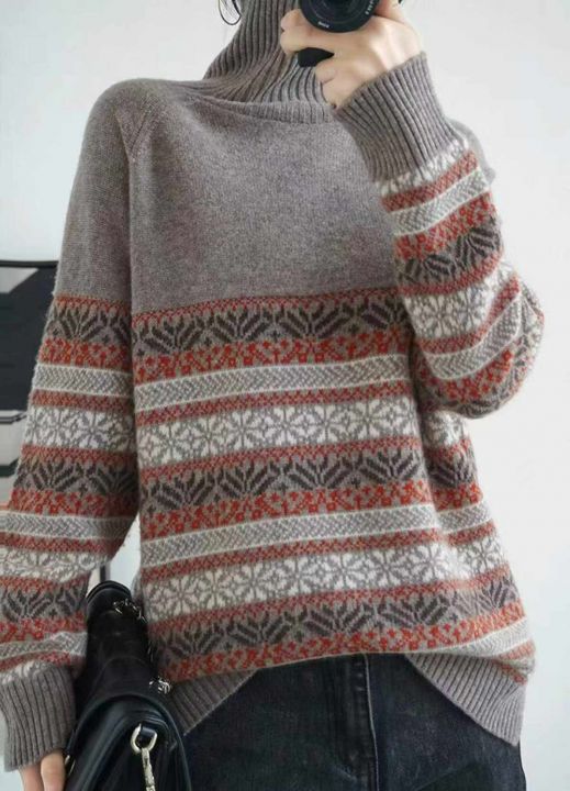 秋冬新款高领提花复古宽松微胖MM韩系慵懒风加厚套头毛...