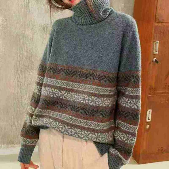 秋冬新款高领提花复古宽松微胖MM韩系慵懒风加厚套头毛衣,独立包装,码数L-...