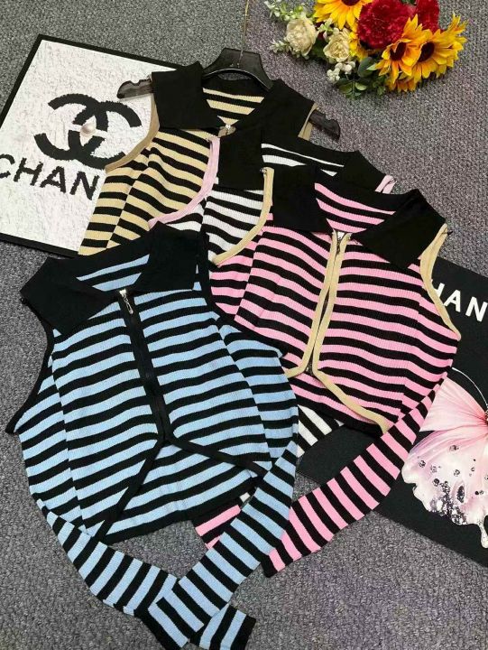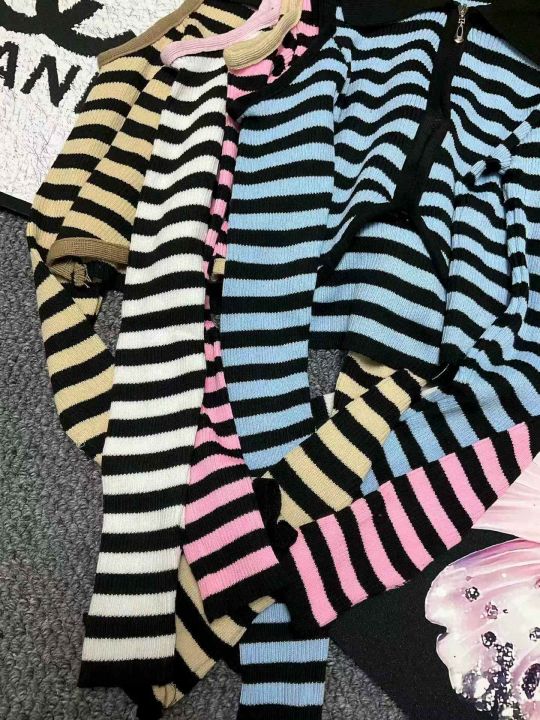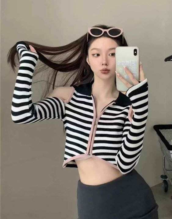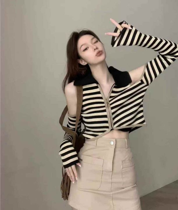 春秋新款性感辣妹纯欲撞色条纹POLO领露肩针织拉链开衫...