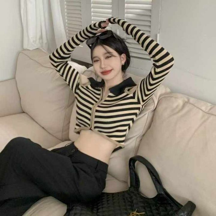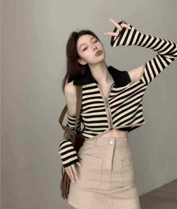 春秋新款性感辣妹纯欲撞色条纹POLO领露肩针织拉链开衫...