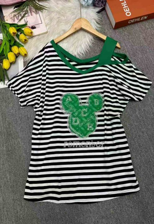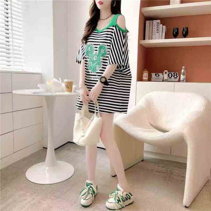 纯棉条纹露肩短袖t恤女夏装学生中长款半袖上衣潮ins,独立包装,M-XL,数量94件,货号118#23