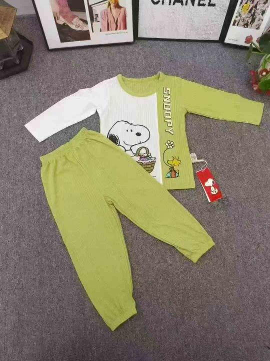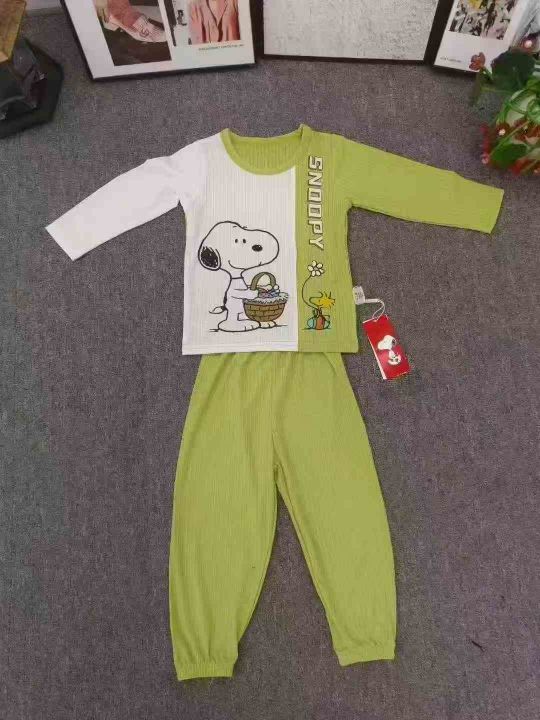 品牌童装长袖家居服套装,数量500套左右,尺码90--150,大码多,整款单色两个品牌(史努比、baby),独立包装带吊牌,货品整洁质佳
