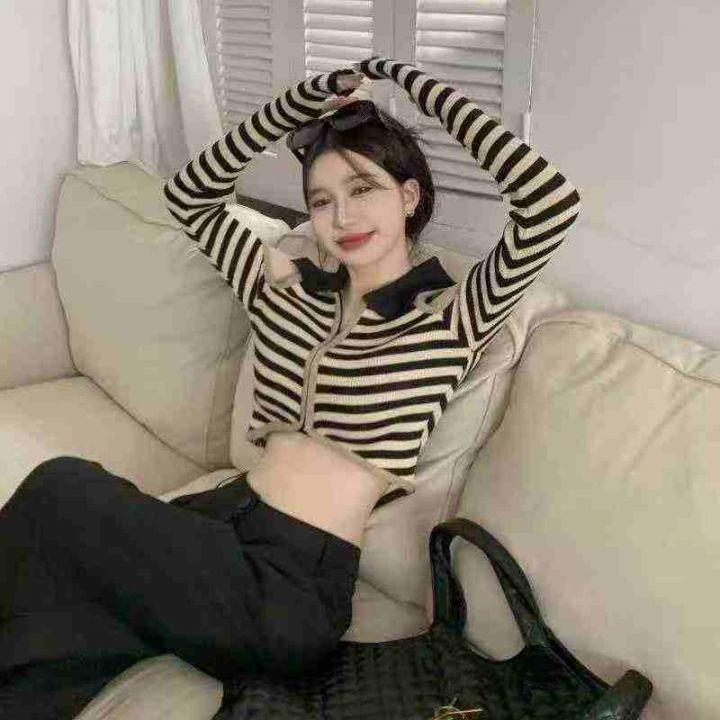 春秋新款性感辣妹纯欲撞色条纹POLO领露肩针织拉链开衫,独立包装,均码面料...