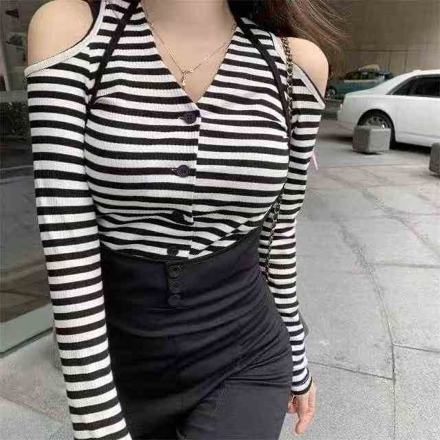 春夏季新款纯欲风V领露肩小心机设计感条纹显瘦针织开...