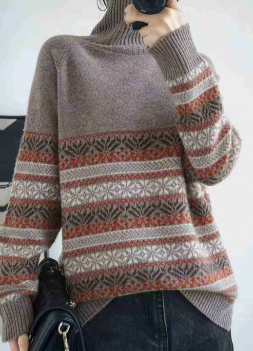 秋冬新款高领提花复古宽松微胖MM韩系慵懒风加厚套头毛...