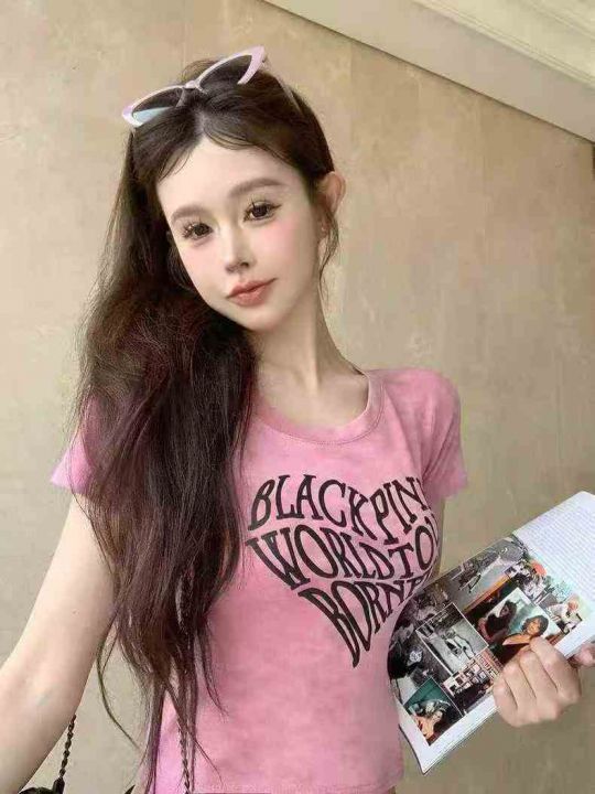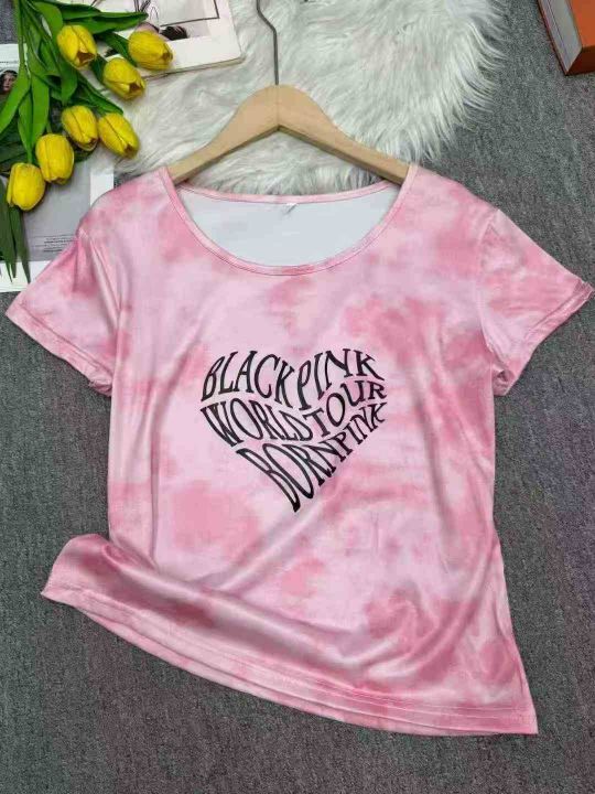 全清价5.9韩版小众扎染爱心字母印花短袖T恤显瘦短款辣...