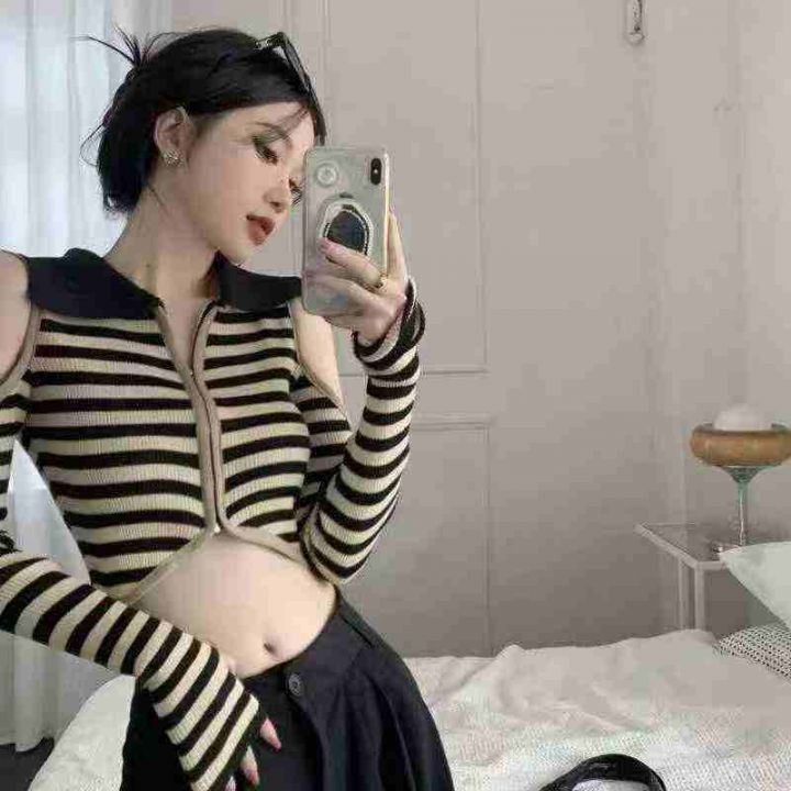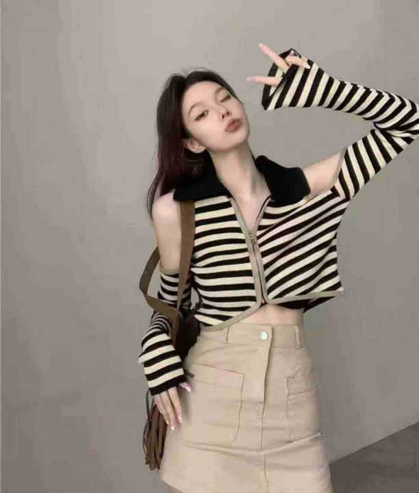 春秋新款性感辣妹纯欲撞色条纹POLO领露肩针织拉链开衫...
