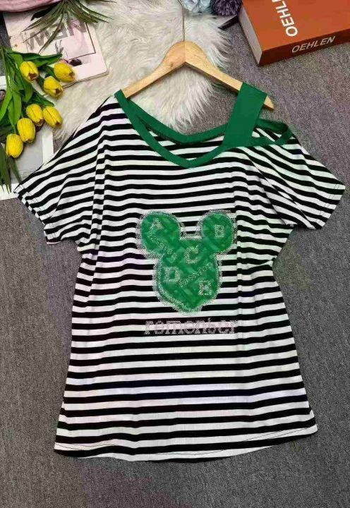 纯棉条纹露肩短袖t恤女夏装学生中长款半袖上衣潮ins,独立包装,M-XL,数量94件,货号118#23