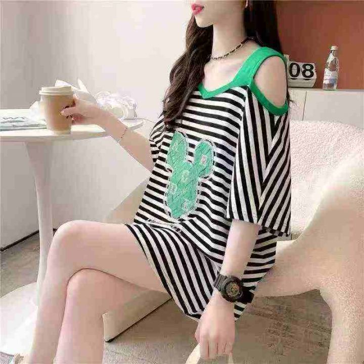 纯棉条纹露肩短袖t恤女夏装学生中长款半袖上衣潮ins,独立包装,M-XL,数量94件,货号118#23