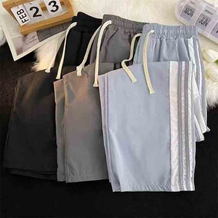360件左右男款春夏侧边条纹排扣抽绳运动休闲裤,整款3色,码M-2XL,蓝色比例多,独立包装