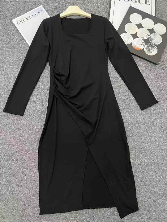 ☕️法式黑色方领开叉长袖连衣裙女秋季新款收腰显瘦长裙赫本风小黑裙200件全清6.8元,分货7.8元。码数S到XXL,高弹力单款黑色[庆祝][庆祝][庆祝]
