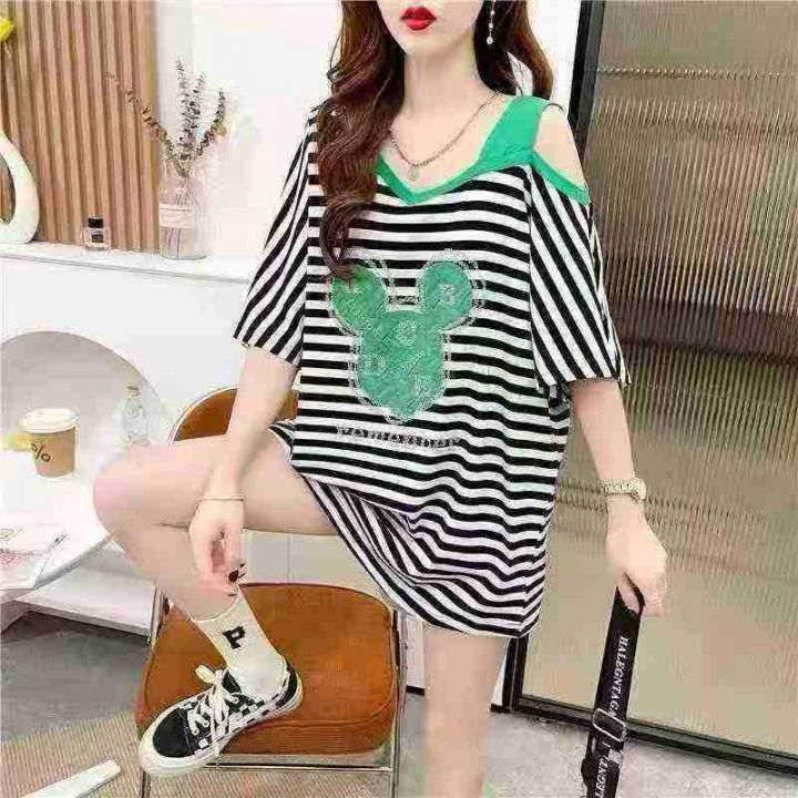 全清价5.9纯棉条纹露肩短袖t恤女夏装学生中长款半袖上衣潮ins,独立包装,M...
