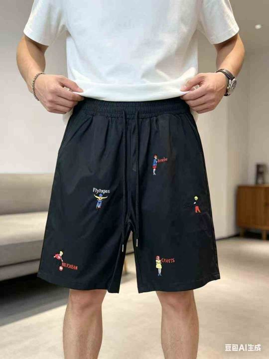 240件左右潮牌美式高街风趣味小人刺绣宽松休闲五分短裤,抽绳设计两侧有口...