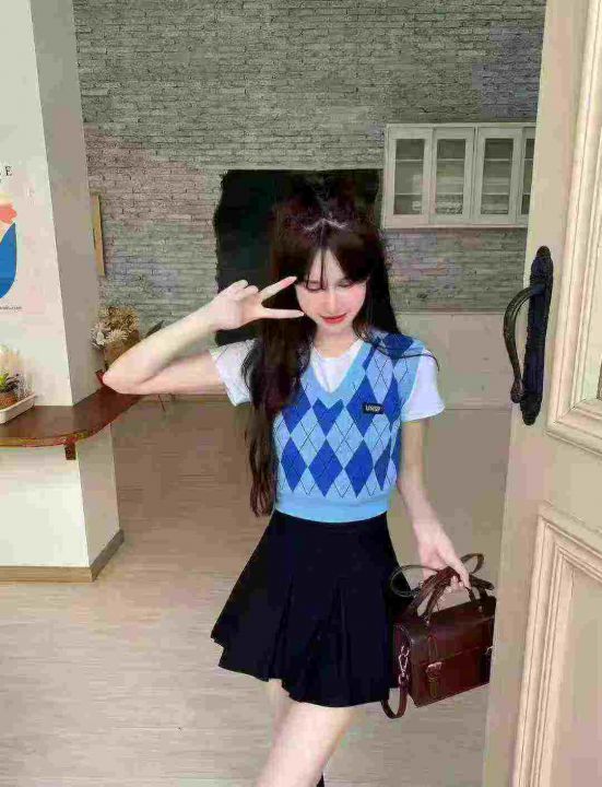 复古蓝色菱形格纹马甲2025春秋新款V领短款针织上衣宽松坎肩外穿潮,550件,...