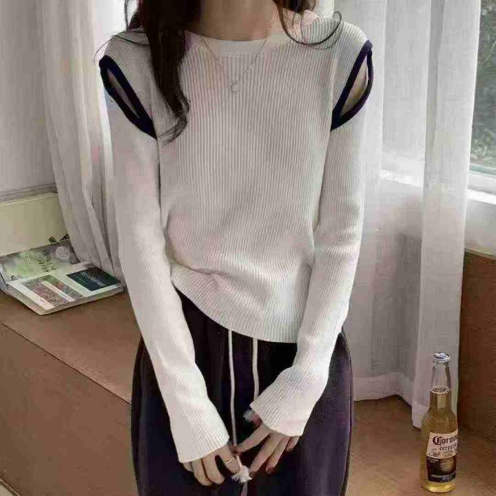 针织撞色镂空修身上衣女秋冬百搭显瘦可外穿内搭毛衣,...