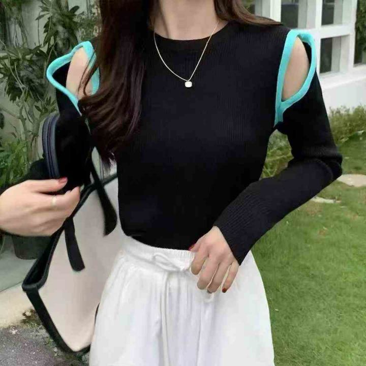 针织撞色镂空修身上衣女秋冬百搭显瘦可外穿内搭毛衣,...