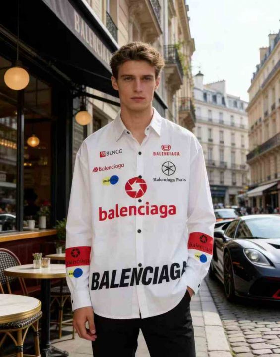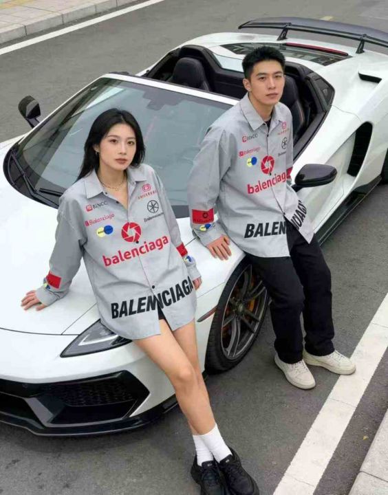 美式潮牌原创巴黎风格满印赛车风衬衫情侣同款衬衫,数...