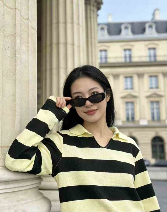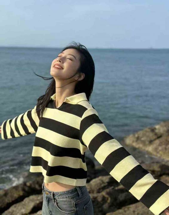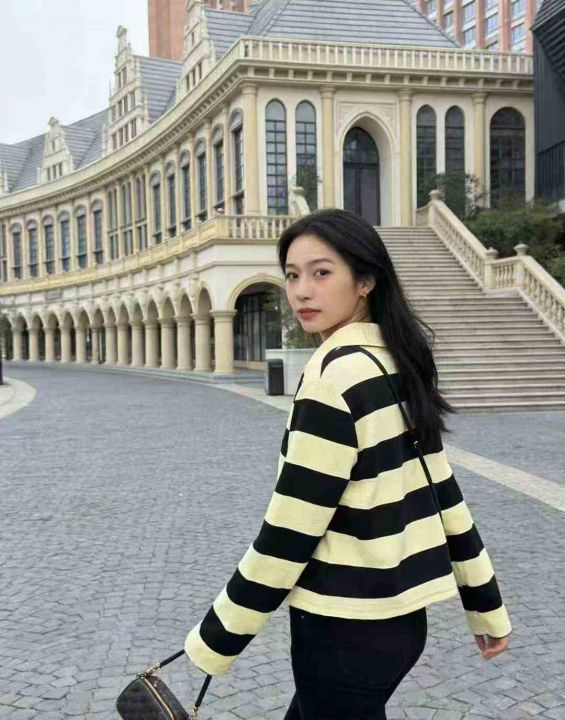 爆款秋季百搭休闲POLO领条纹宽松女新款慵懒风上衣,数...