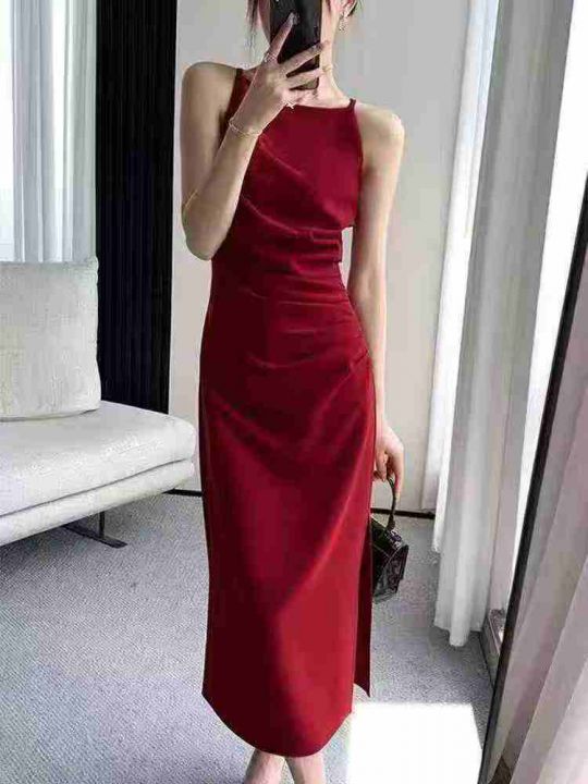 ☕️法式复古修身荡领性感吊带连衣裙女晚会宴会伴娘礼...