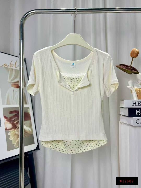 夏季新款蕾丝花边拼接假两件修身显瘦纯欲穿搭短款T恤...