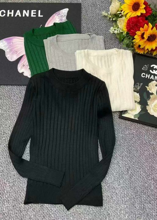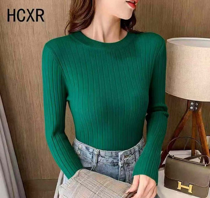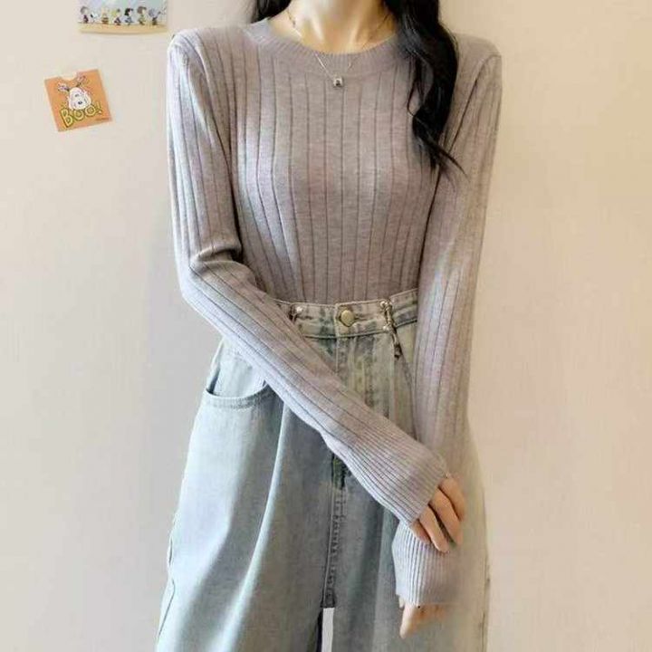 秋冬新款韩系净版弹力修身显瘦圆领坑条包芯纱套头毛衣...
