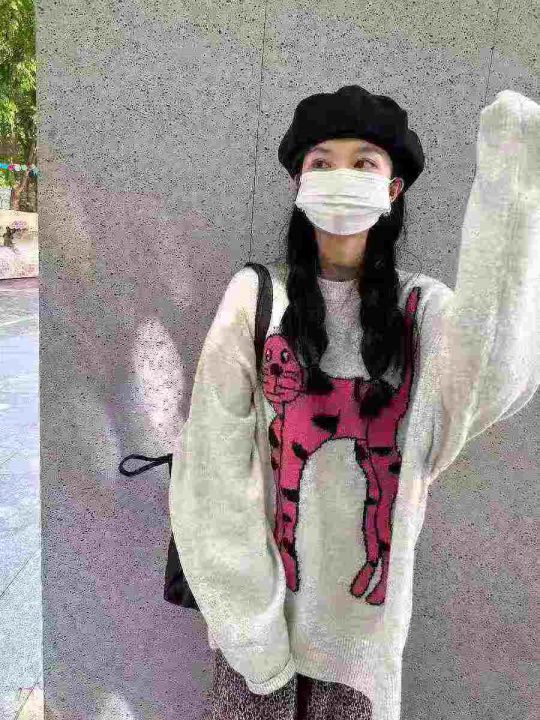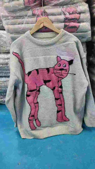 100件秋冬款韩版卡通小猫咪提花,慵懒学院风套头宽松设计针织毛衣,新款百搭,独立包装